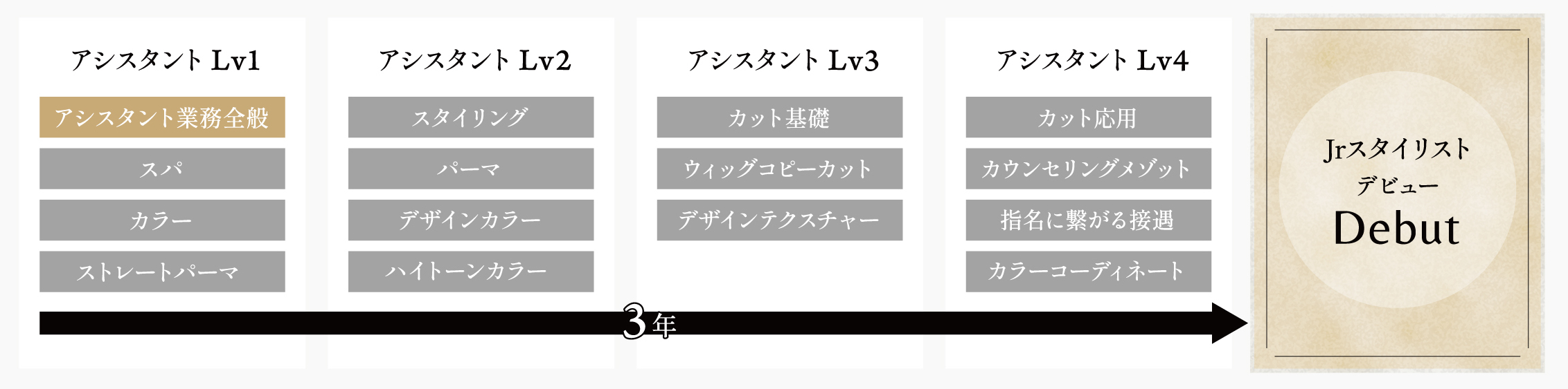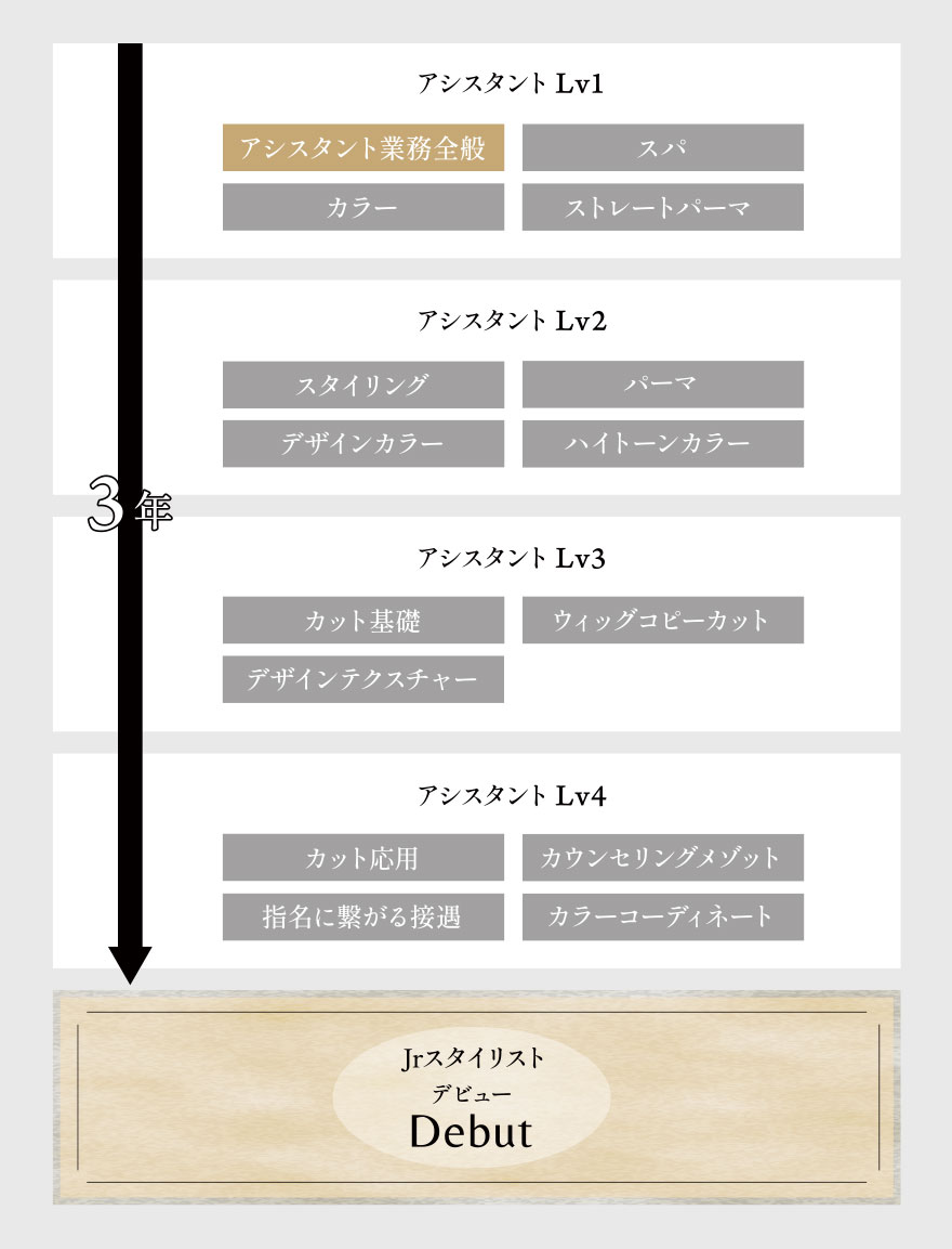 アシスタントで6ランク、スタイリストで12ランクにランクが分かれており、月に2回のテストで合格すると、ステップアップできる仕組みです。
